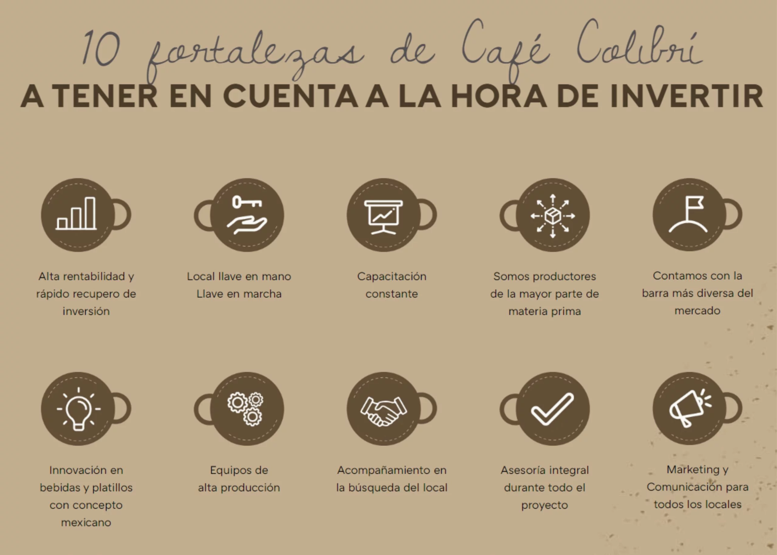 El gran diferencial que ofrecen a sus franquiciatarios, es la producción de insumos: son productores directos. Fabrican; café, jarabes, cremas, licores y dulces, lo que permite mantener precios competitivos.